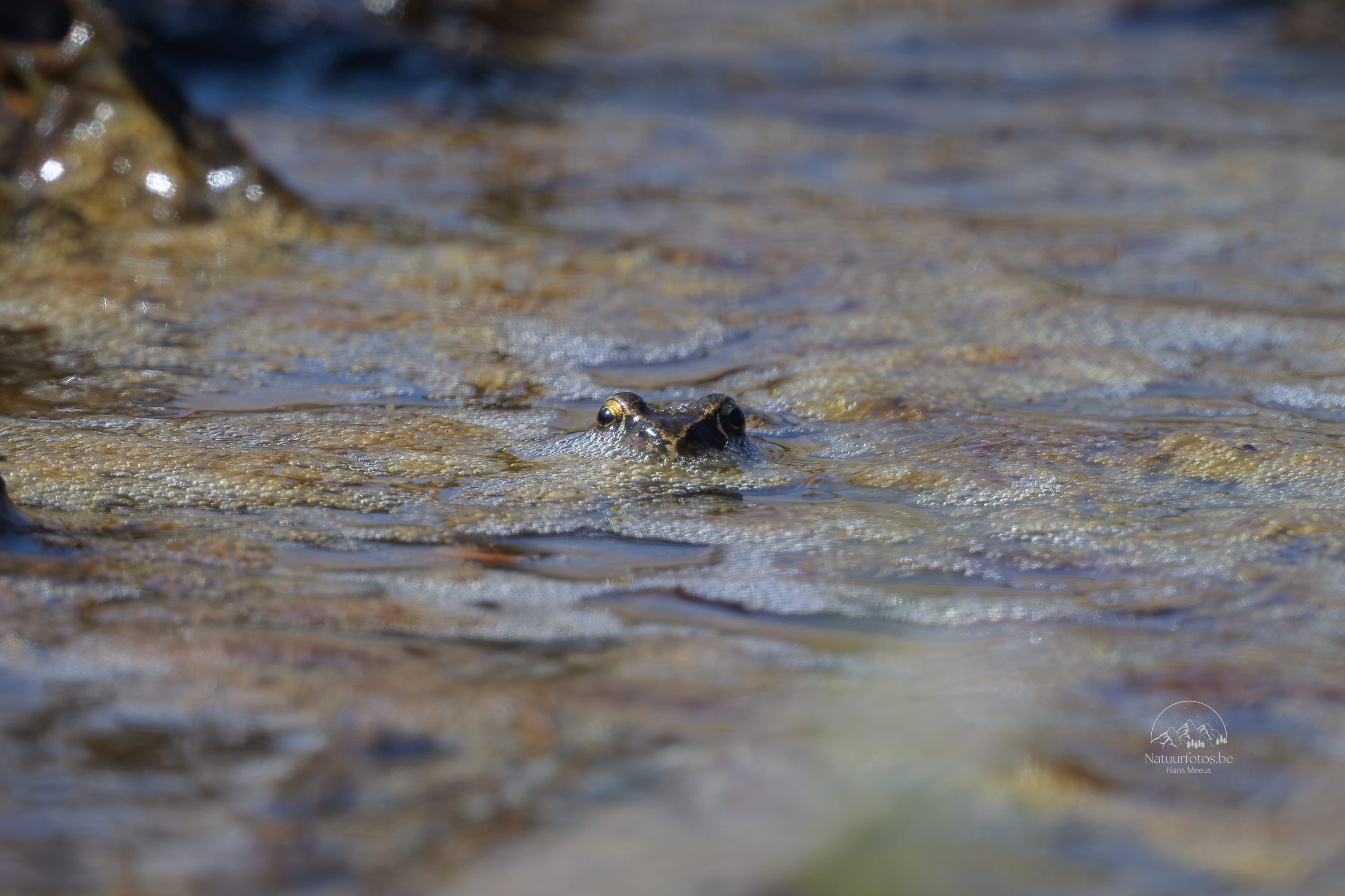 De kikkers zijn aan het ontwaken, ik trapte al bijna op eentje, die sprong net weg en probeerde zicht te verbergen om een kleine plas vuil water.