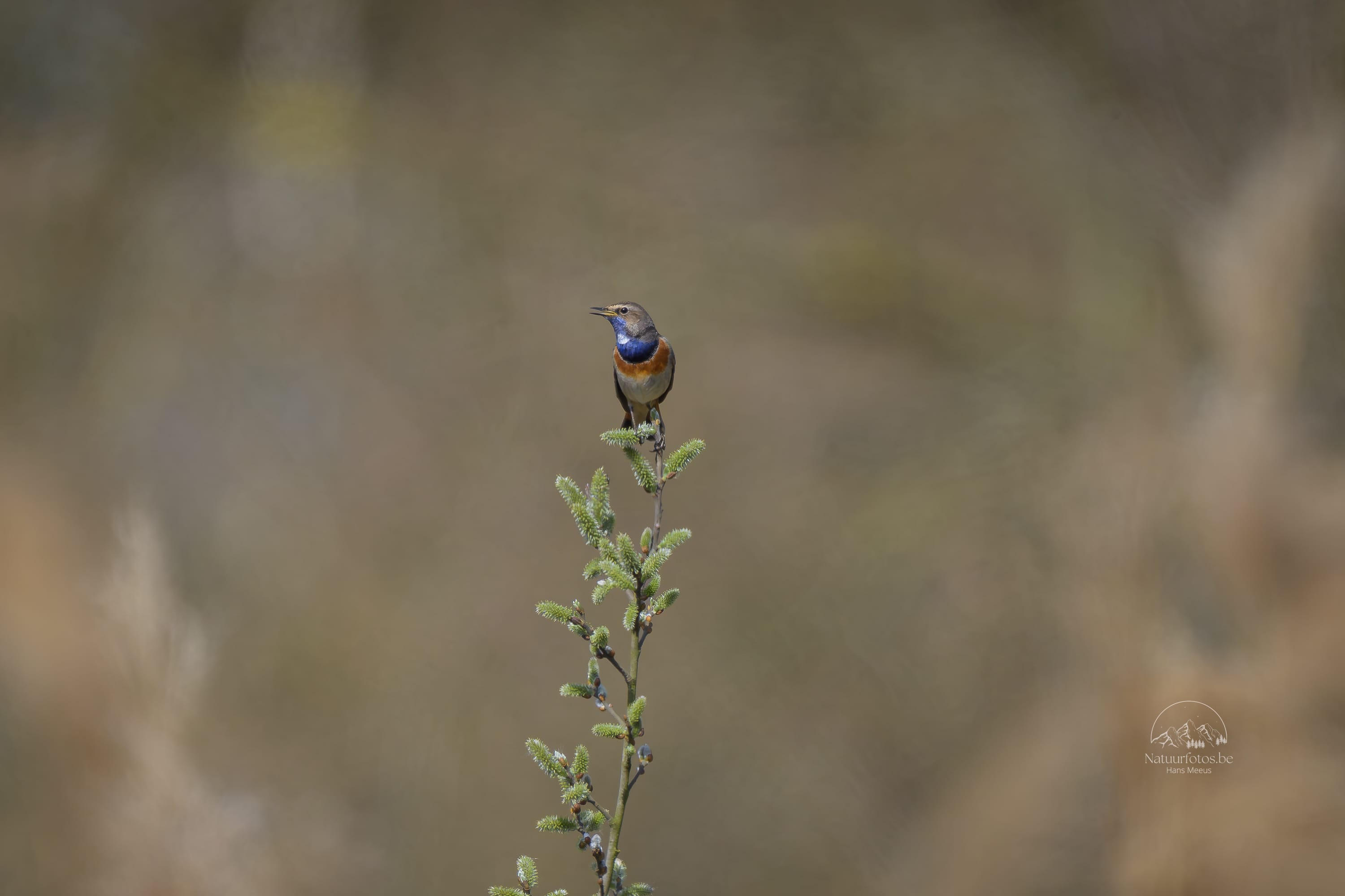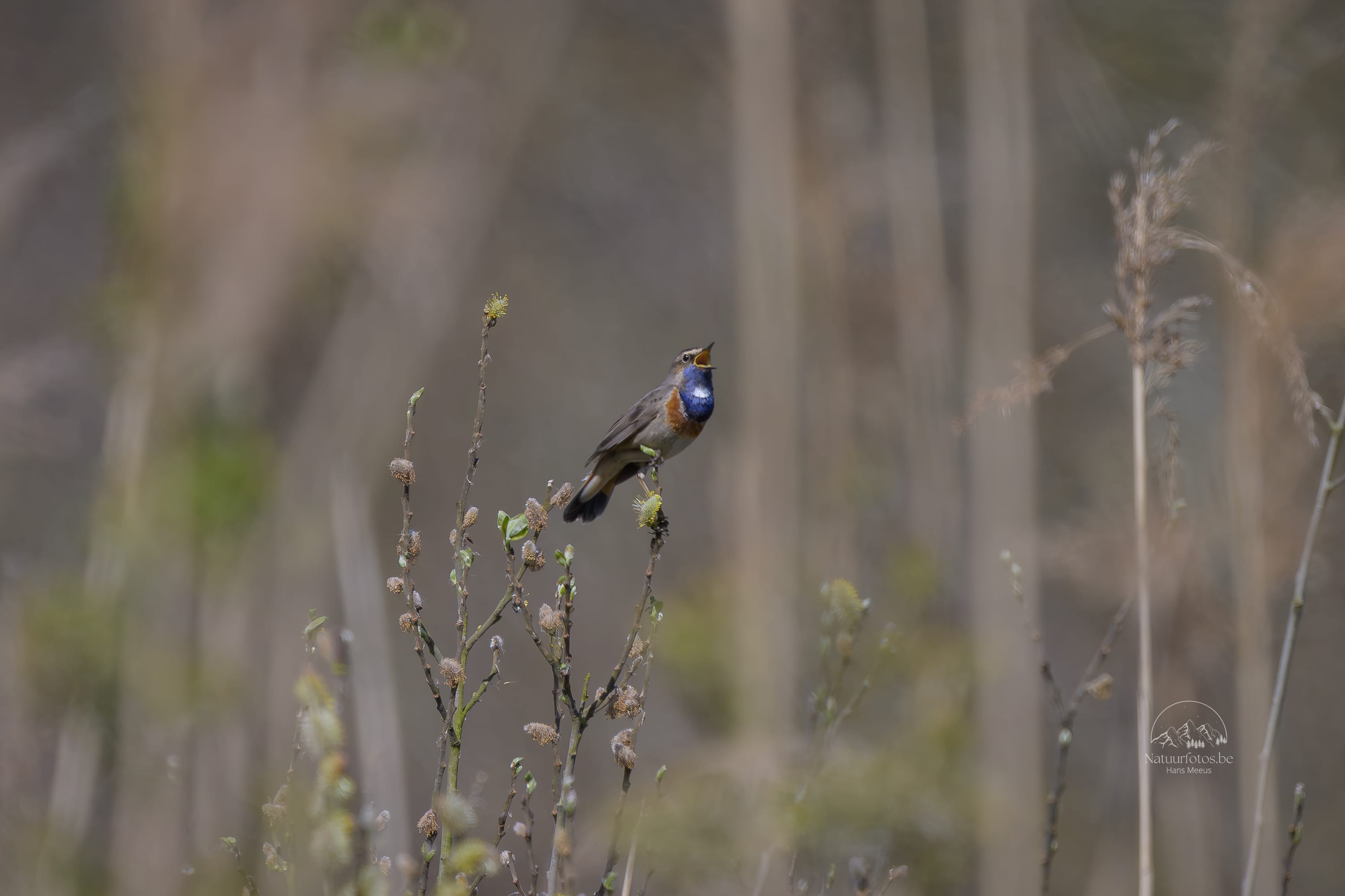 En dan begint het leuke, waar zit die kleine vogel… hij valt uiteraard wel op met zijn blauw borstje maar hij of zij verschuilt zich vaak onder in het riet of in een struik.  Af en toe gaat die wat hoger zitten en zingt die, da’s het moment, daar moet je klaar voor zijn.  Dus zet u dan maar neer, camera klaar, sluitersnelheid ingesteld, focus punt vastgesteld op het riet, diafragma oke, en niet stressen als ge hem ziet, rustig aanleggen want met 800 mm is dat altijd effkes zoeken…