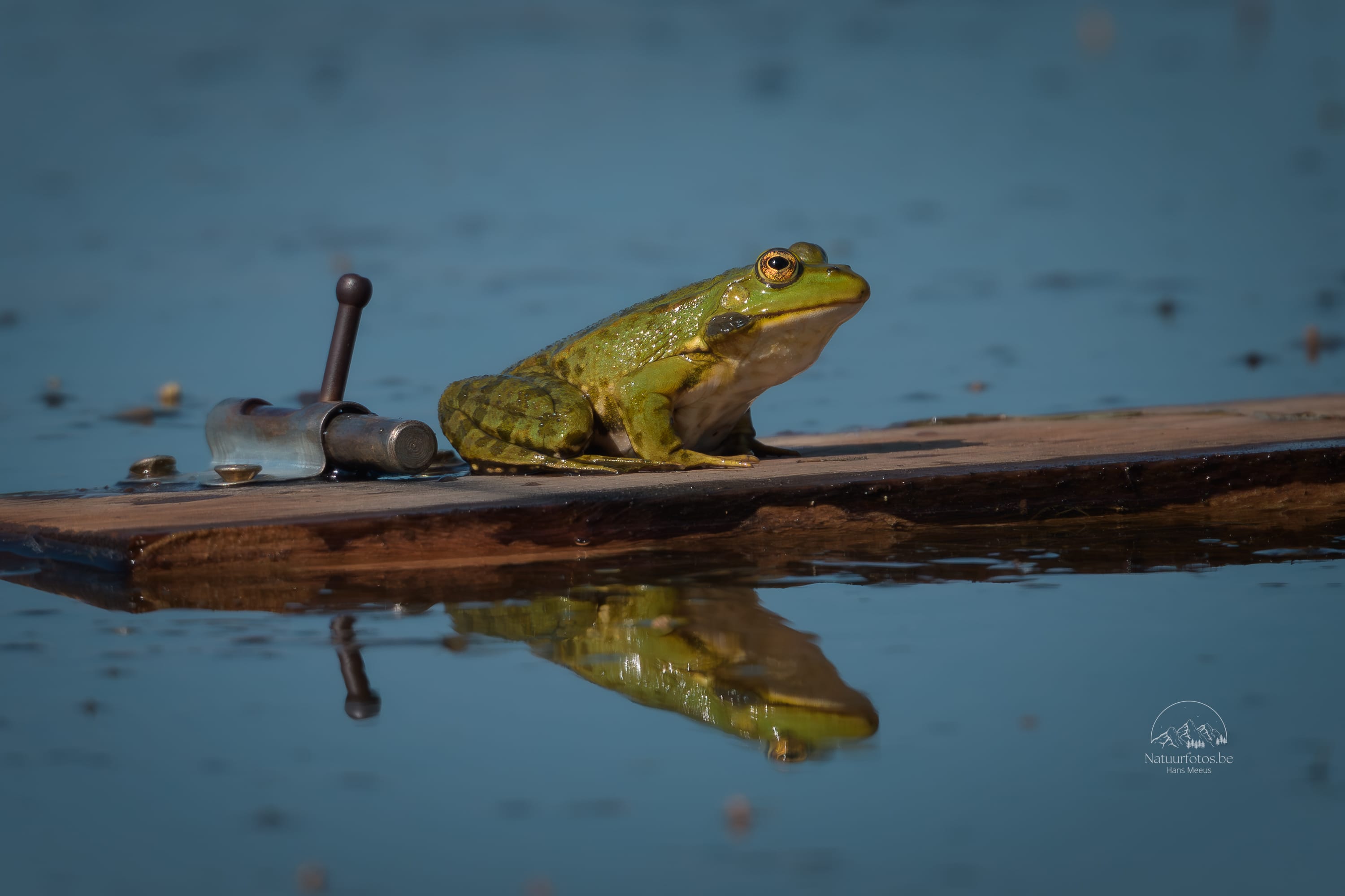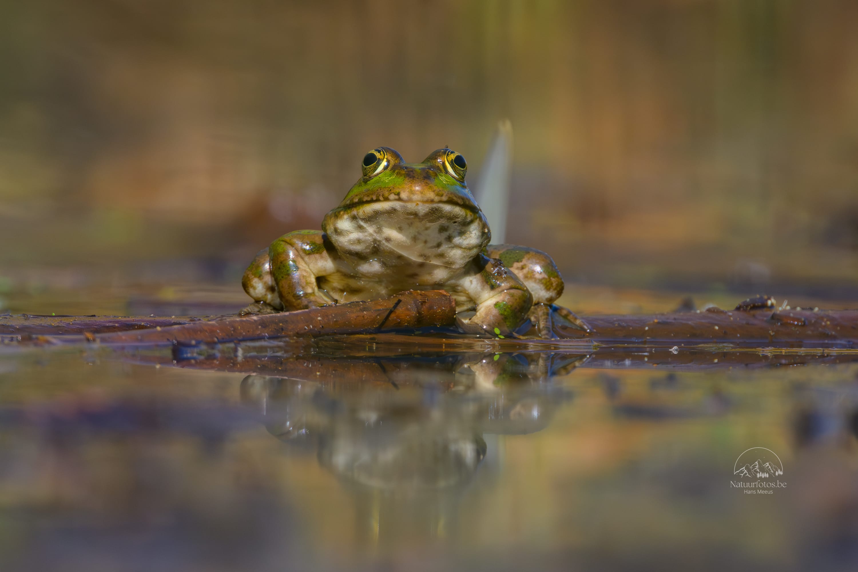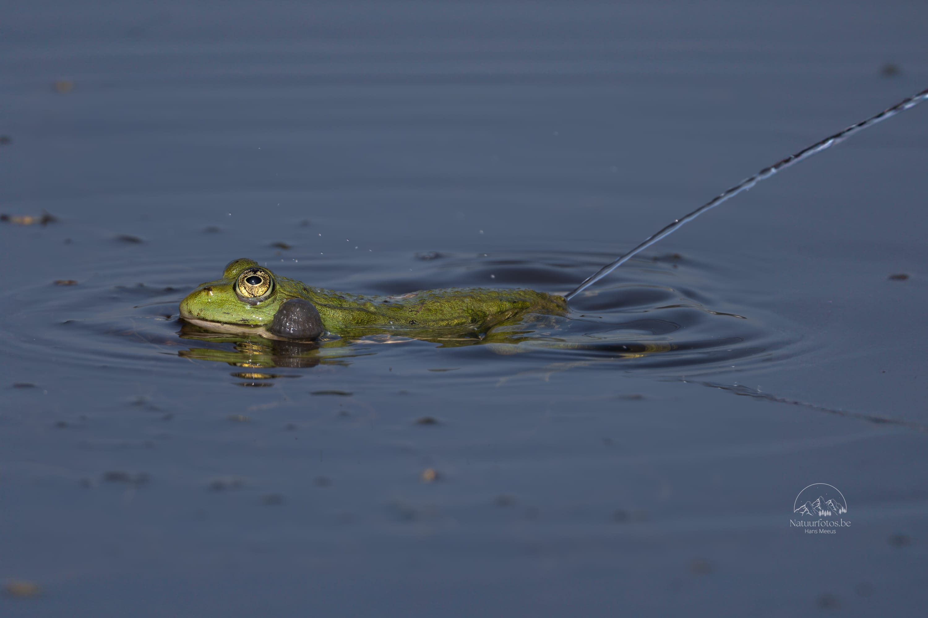 In het zonnetje zaten ze op het drijvende hout luid te roepen, terwijl hun keelzakken als kleine ballonnen opzwollen bij elke kwaak. De sloot werkte als een soort natuurlijk podium: rustig water, zonlicht en voldoende plek om te zitten.